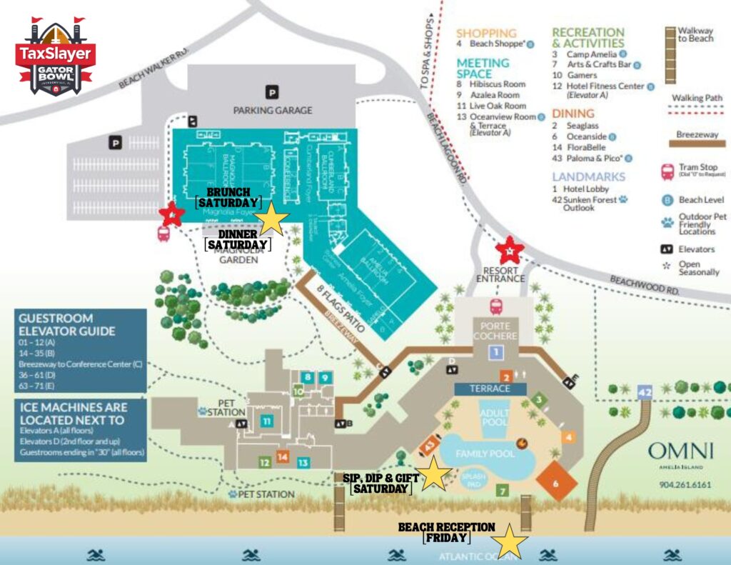 Event locations are marked below by yellow stars! Golf is played at Little Sandy, located on property near the Shoppes at Omni Amelia Island – driving your car or taking the shuttle are recommended.