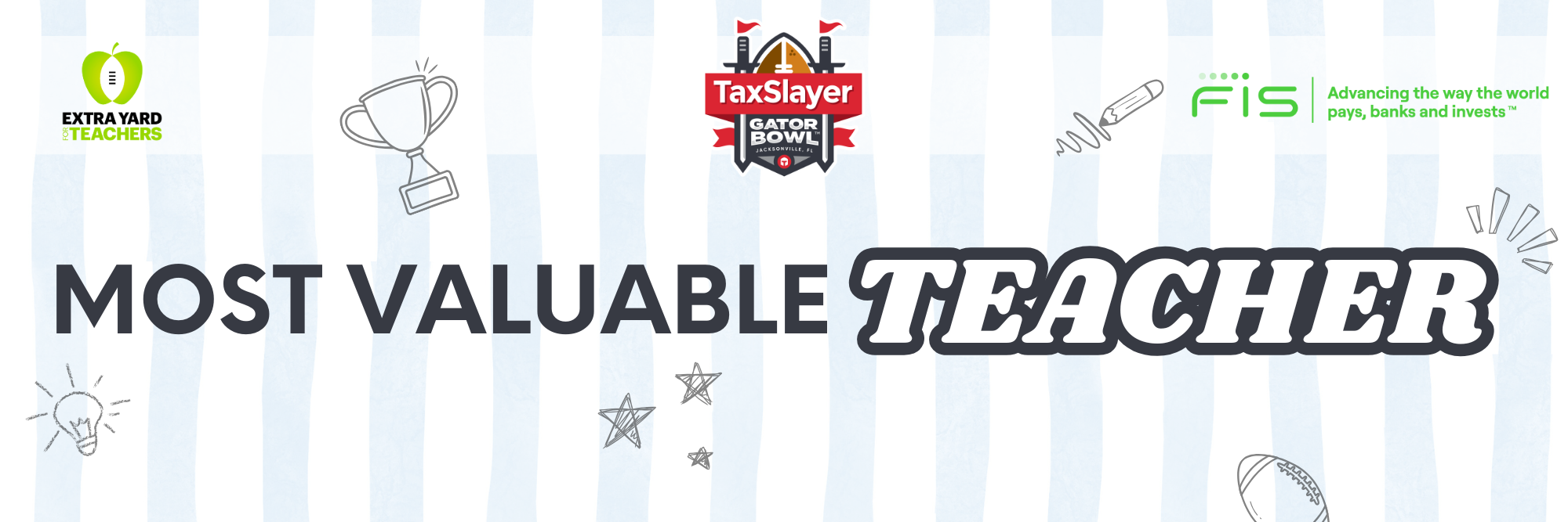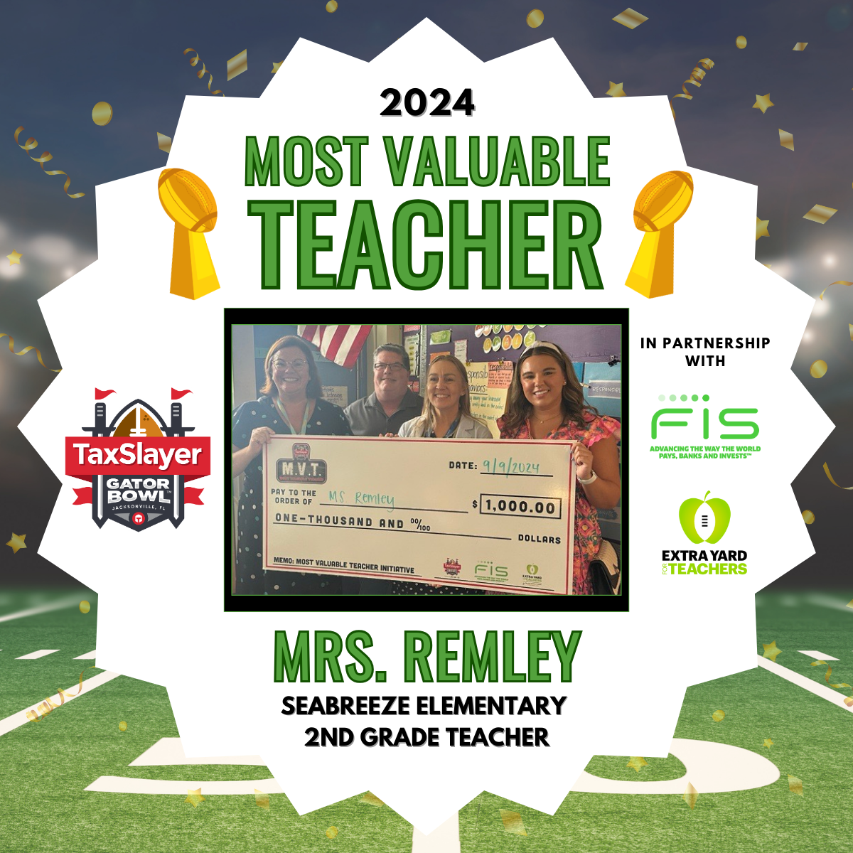 The TaxSlayer Gator Bowl MVT (Most Valuable Teacher) initiative was designed to celebrate and support teachers in our community as it’s no question they are the playmakers of the classroom. To support them, the TaxSlayer Gator Bowl in partnership with the College Football Playoff Foundation and FIS have designated $16,000 this year to give back to local teachers throughout college football season.